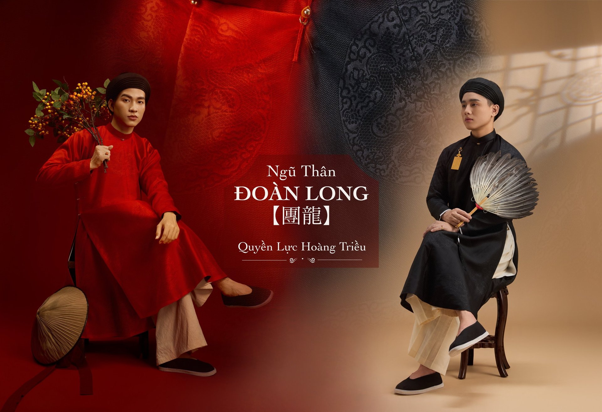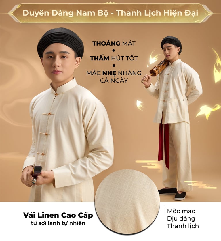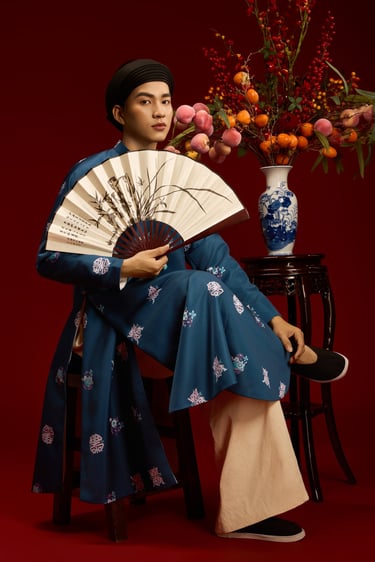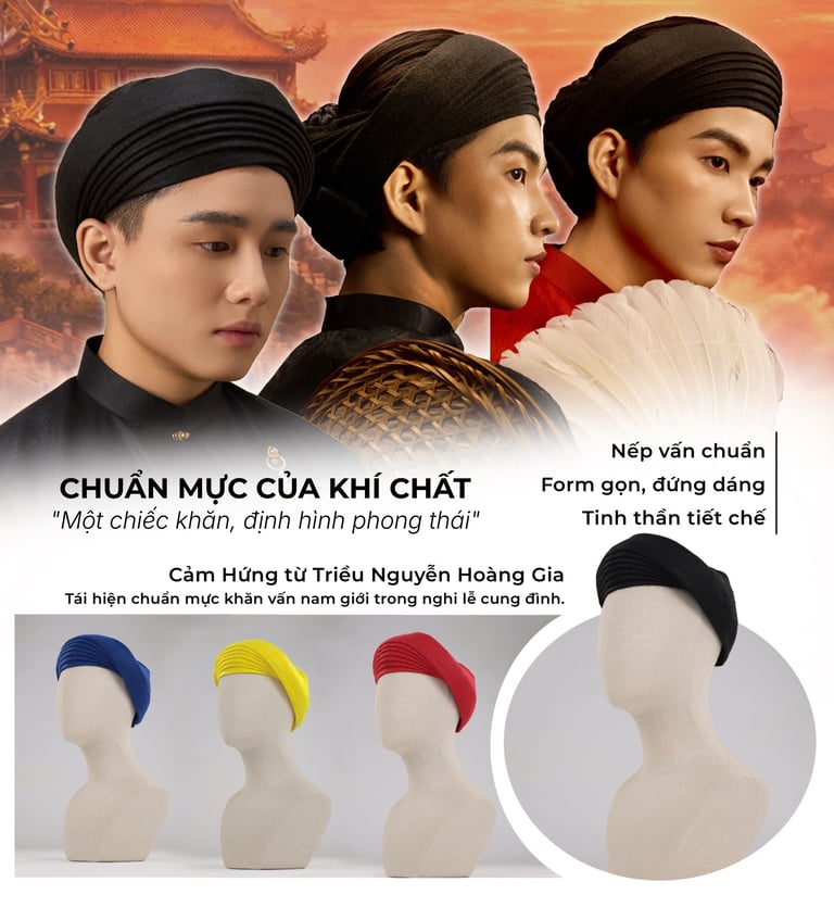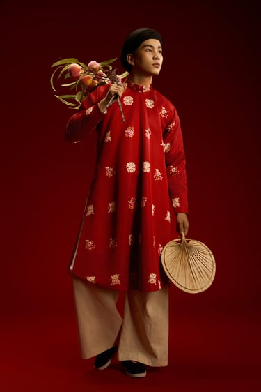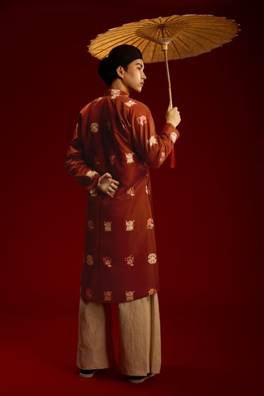 “Ngũ thân chuẩn mực – họa tiết Trường Thọ – sắc màu cát tường, kết tinh vẻ đẹp truyền thống trong diện mạo nam giới hiện đại.”