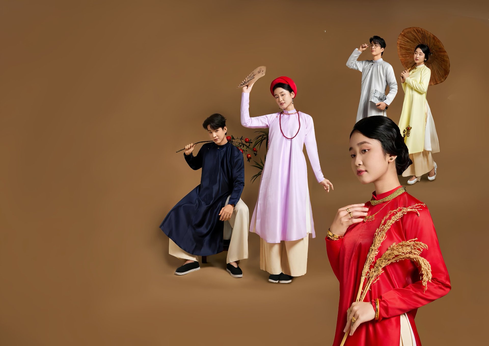 Một bộ ngũ thân lai cách tân, màu pastel, form dài chấm đất, gài nút từ nam sang nữ, tôn dáng. Dành cho ứng dụng vào đời sống – đặc biệt phù hợp sự kiện cưới hỏi.